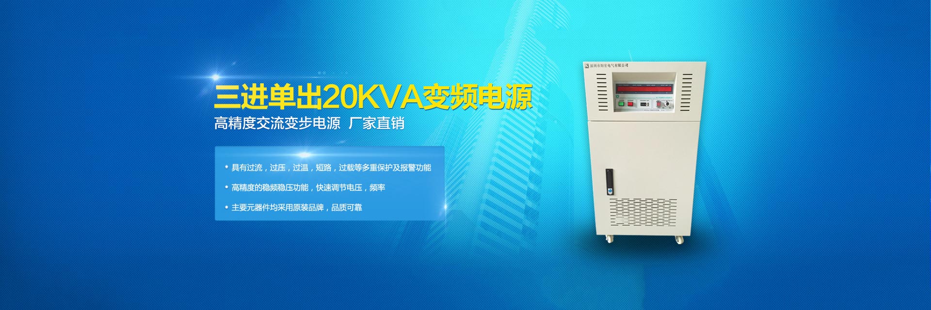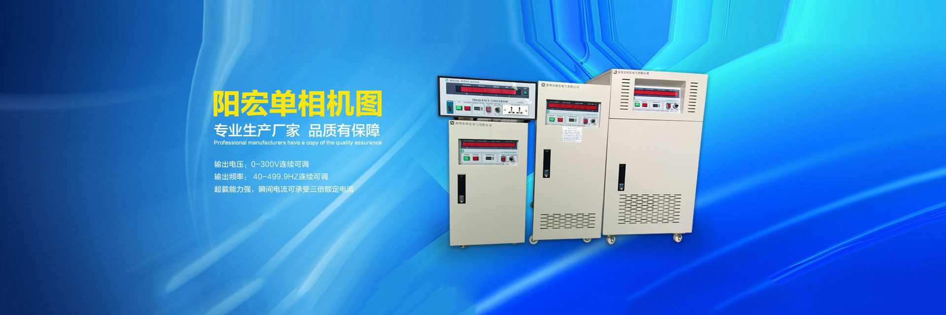 20年變頻電源制造品質-陽宏變頻電源為您提供5KVA變頻電源,10KVA變頻電源,20KVA變頻電源,30KVA變頻電源,45KVA變頻電源,60KVA變頻電源,75KVA變頻電源,深圳單相/三相/交流變頻電源等。 模擬式變頻電源,晶體管式變頻電源,可編程式變頻電源,單相大功率變頻電源,三相大功率變頻電源是陽宏電源股份有限公司的核心產品。深圳市陽宏電氣有限公司隸屬臺灣陽宏電源股份有限公司,是一家變頻電源開發(fā)、研制、生產、銷售和服務的高新技術企業(yè)。其大陸工廠:深圳市陽宏電氣有限公司,是臺灣陽宏電源股份有限公司在中國大陸一家分公司,地址:深圳市寶安區(qū)觀瀾街道觀瀾高新科技園區(qū)。 臺灣陽宏電源股份有限公司創(chuàng)建于1995年,目前除了臺北公司以外,在中國的廣東深圳設有分公司,工廠擁有許多的先進設備。具有年產各種電子儀器電源設備20000臺以上,工廠有嚴格的生產能力,強大的開發(fā)技術的管理制度,可以接受新高技術產品的開發(fā)與研制。